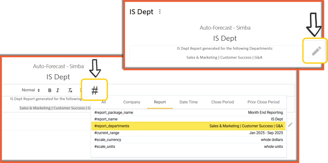 Add a text commentary to the financial results displayed in the report. Smart Labels allow users to reference global metadata that will automatically update. This can be accessed via the “#” button or by simply typing “#” in the text editor. |