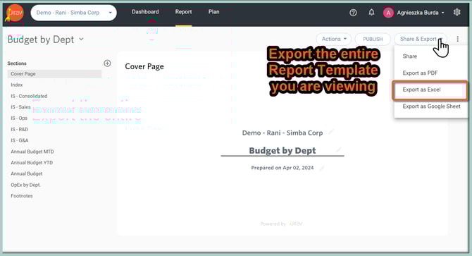 To export an entire Report Package to Excel, select the desired Package, click on the "Share & Export" button in the upper-right-hand corner of the screen to activate the context menu and then select Export as Excel.