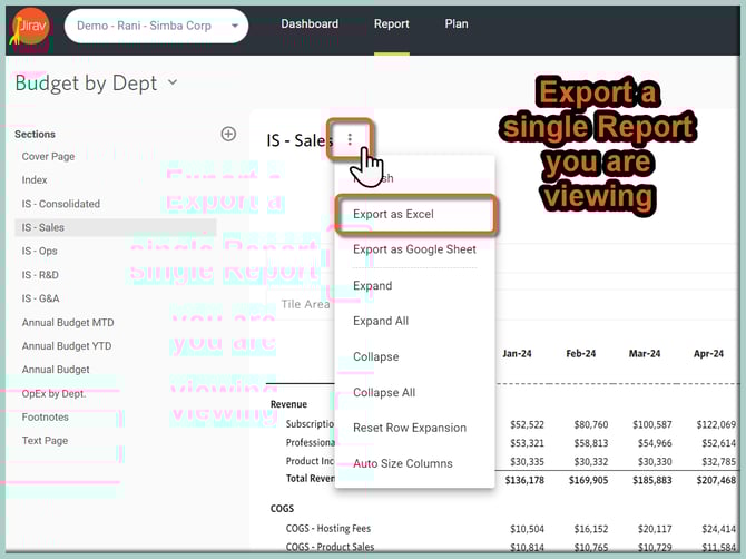 To export the single Report to Excel, select the desired Report, select the ellipses next to the Report Title (...) and then click on Export as Excel: