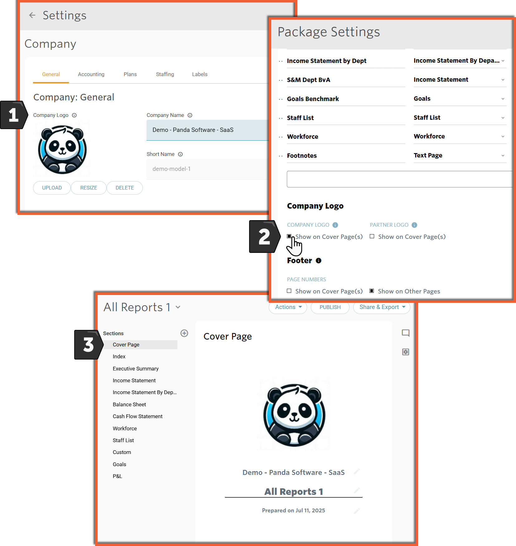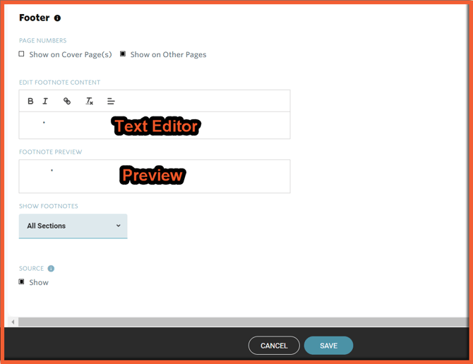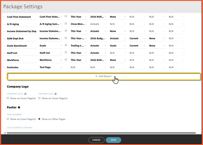 The footer for the Report Package can be customized from the Package Settings screen to include page numbers and/or a footnote.