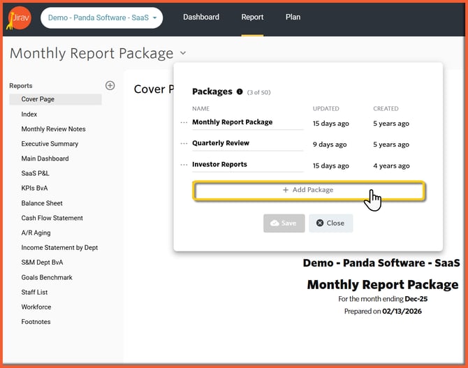 Report Packagtes enable you to create a group of custom reports to simplify your financial reporting process and empower company stakeholders by providing them with up-to-date information. For example, you might have a Month-End Reporting Package that you share each month internally and a Quarterly Review Reporting Package to present externally to your board each quarter.