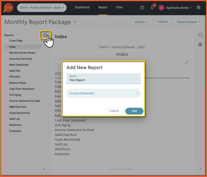To add a Report to a Package, select the + to the right of Reports, name the new Report, choose a Report type, and select Add.