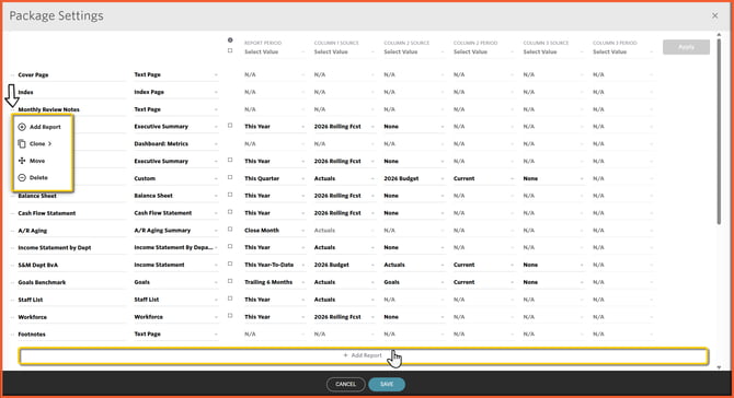 To Add, Clone, Move, or Delete a report from within the Package, select the