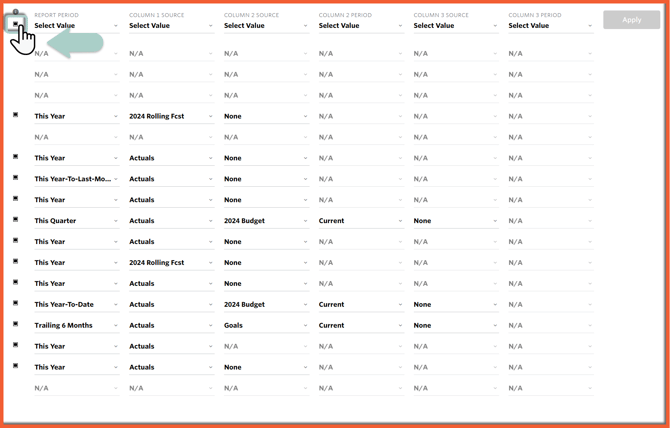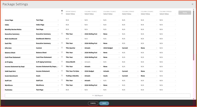 The top row contains the Column Settings. When one or more checkboxes are selected, the Column Settings are activated. This enables you to change the Report Period, Column 1 Source, Column 2 Source, and Column 2 Period, for all of the selected reports.