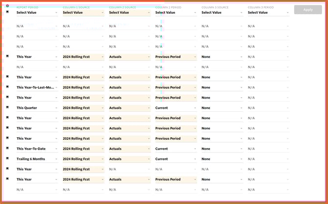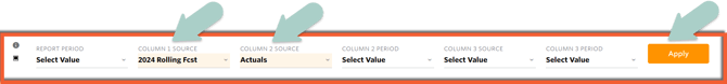 After selecting 2022 Rolling Forecast for the Column 1 Source and Actuals for the Column 2 Source, the Apply button in the upper right is active.