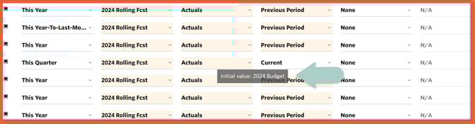 Each field has a dropdown selector and the Date Range column opens up the existing Date Range page. Note that cover pages, text pages, dashboards, and some fields in the Cash Flow Statement and Staff List reports do not have fields in which a value can be applied, so in these cases, N/A will be shown.