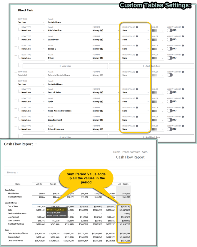 The Sum Period Value adds all values within the specified period. While it is typically used for Income Statement items, as shown in the screenshot below, it can also be used to summarize Cash Inflows and Cash Outflows for the period in the Cash Flow Statement.