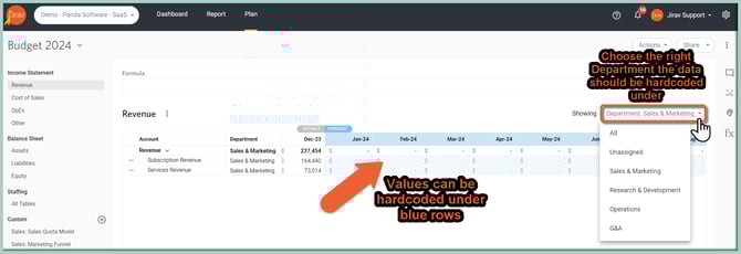 Income Statement values can be hardcoded under blue rows from the specific Department level. To accomplish this, navigate to each of the Income Statement sections as Revenue, COGS, OpEx, and Other, choose the right Department, and hardcode values under it: