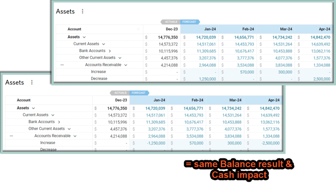 You can hardcode Increase and Decrease as positive values separately under each line, or you can hardcode Decreases as a negative value under the Increase Line - the result and Cash impact will be the same.