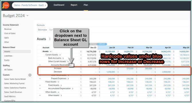 Balance Sheet accounts automatically roll forward the prior month's balance from Actuals by default. Balances under the Forecast Period can be adjusted by clicking on the dropdown next to each GL account and entering values under blue rows for balance Increase and/or Decrease: