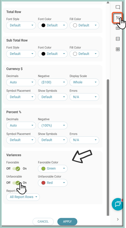 Optionally, click on the % (Formatting) icon under the right navigation panel and toggle the Favorable and Unfavorable Variances on: