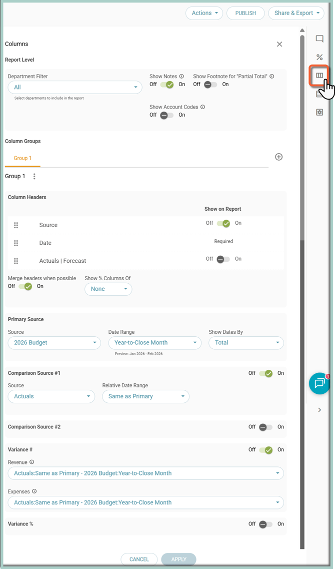 - Toggle Variance # on and set it in the desired way (here: Actuals less Budget)