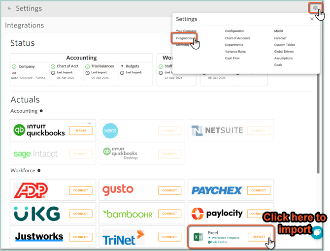 - Download the Workforce Template from Settings⚙️ > Integrations under Excel in the Workforce section.