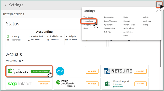 Jirav's foundation is built on your accounting data. To get started, import the chart of accounts, account balances, and optionally, a department structure from QuickBooks. Follow these steps to import your accounting actuals from QuickBooks.