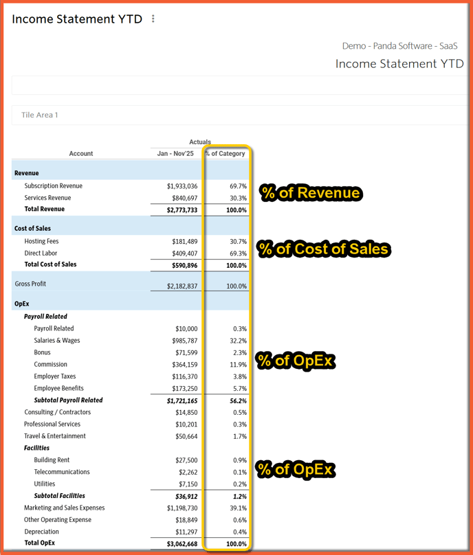 | Category | Shows line item as a percentage of its parent Category total. Category references the account’s applicable category rollup. |