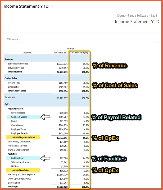 | Sub-category | Shows line item as a percentage of its immediate Sub-category total. Sub-Category references the sub-account’s applicable roll-up. |