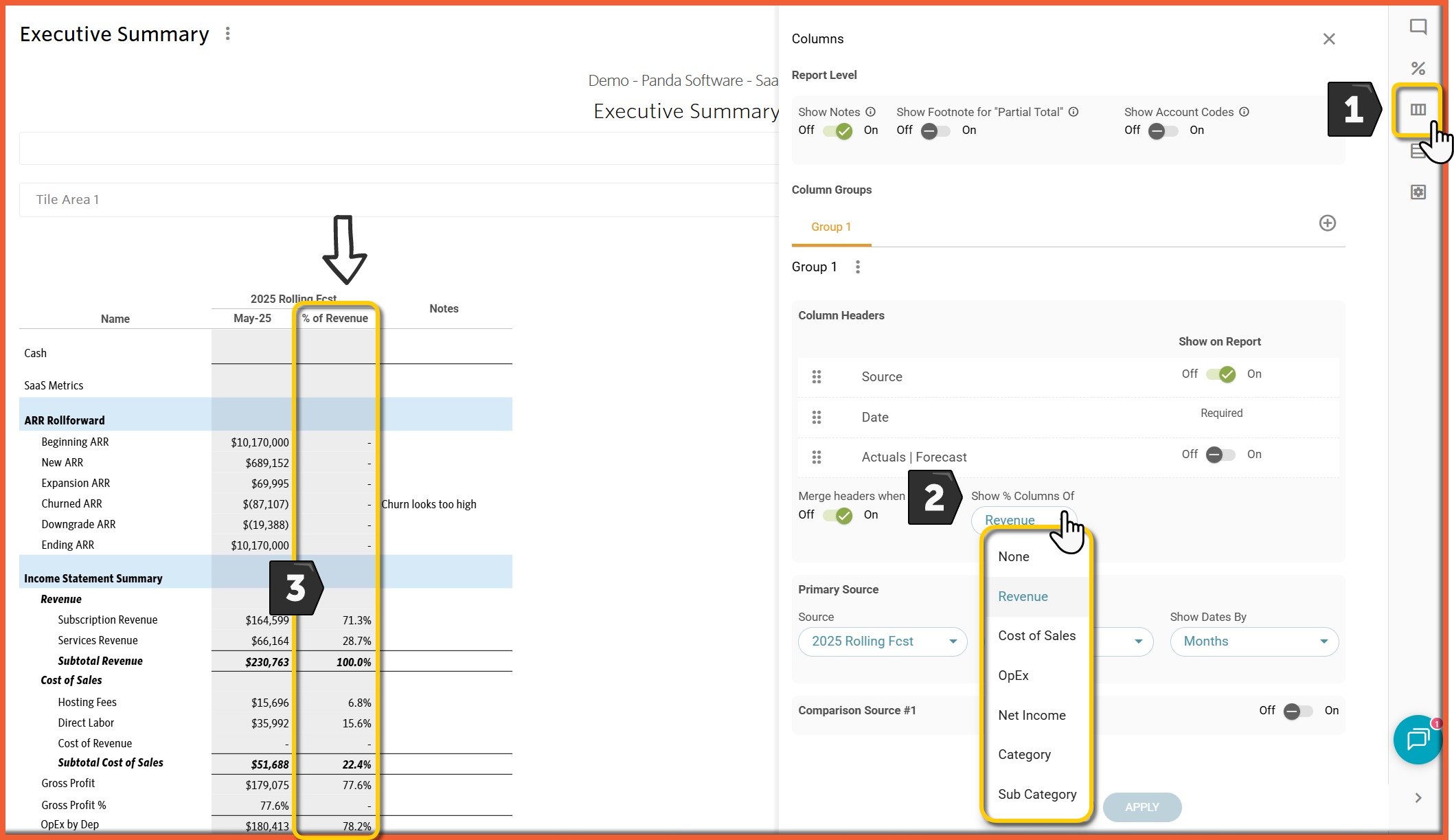 Add a % of Reference column to the Income Statement and Executive Summary reports, which can reference Revenue, COGS, OpEx, Net Income, specific Category or Sub Category