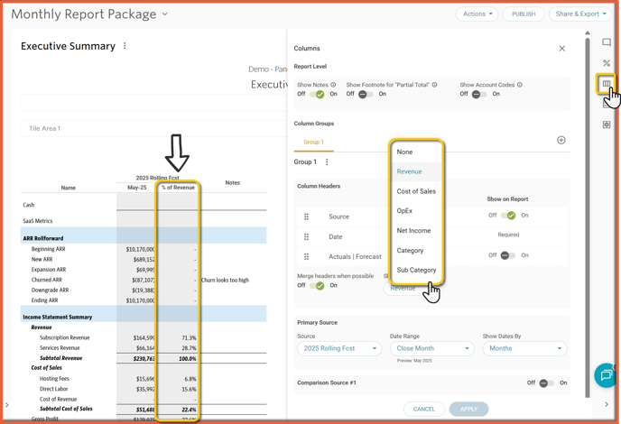 % of Revenue Column (or other reference) on the Executive Summary Report