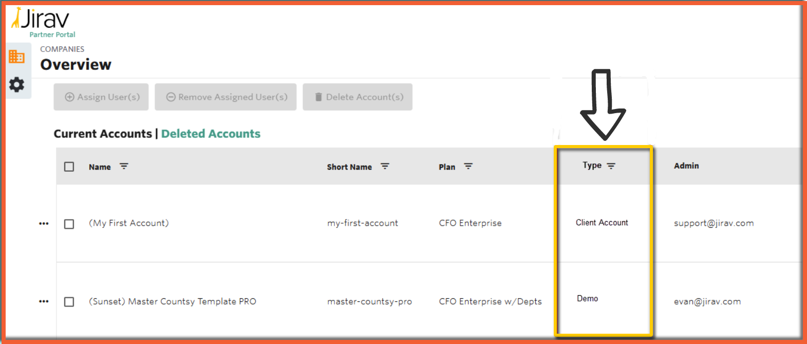 - The Jirav Account designation (Client Account, Firm Account, or Internal) will be displayed as read-only in the partner portal and passed on to HubSpot for billing purposes.
