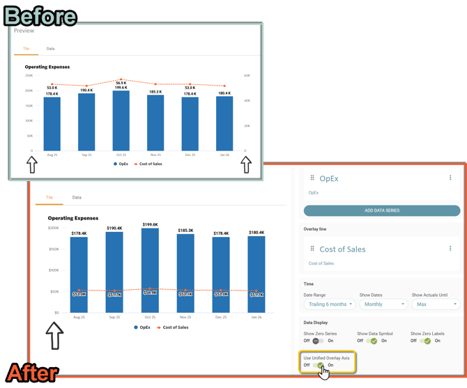 - Toggle on a “Unified Overlay Axis” which will change the tile to use one Y-axis