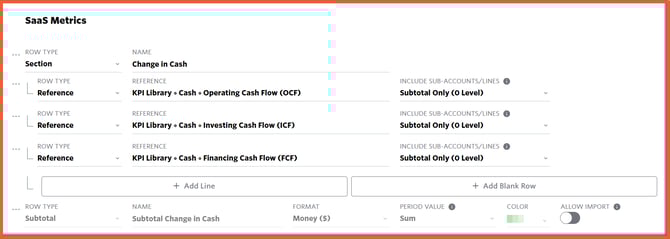 Go to Setup ⚙️> Custom Tables and create a Custom Section named "Change in Cash" with three Reference rows for each Cash Flow Statement activity with a Subtotal for the Section - see the screenshot below.