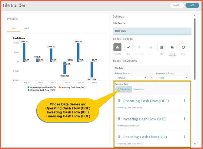 We can also create a "Cash Burn" Dashboard Tile by choosing Data Series as Operating Cash Flow (OCF), Investing Cash Flow (ICF) and Financing Cash Flow (FCF) - all coming from the KPI Library: