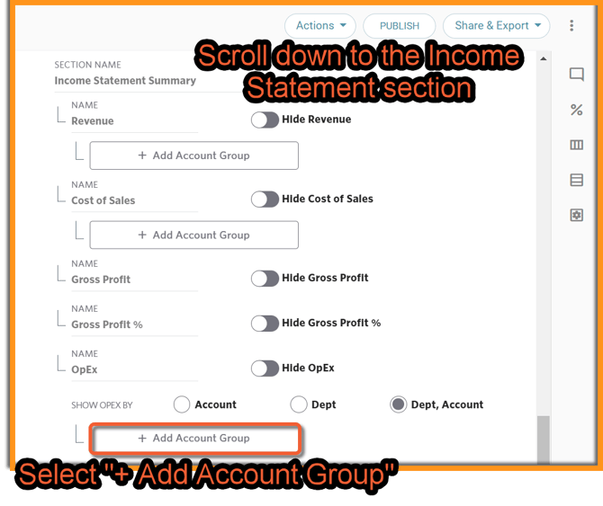3. Once you are in the "Edit Rows", scroll down to the Income Statement section, where you can then select "+ Add Account Groups"