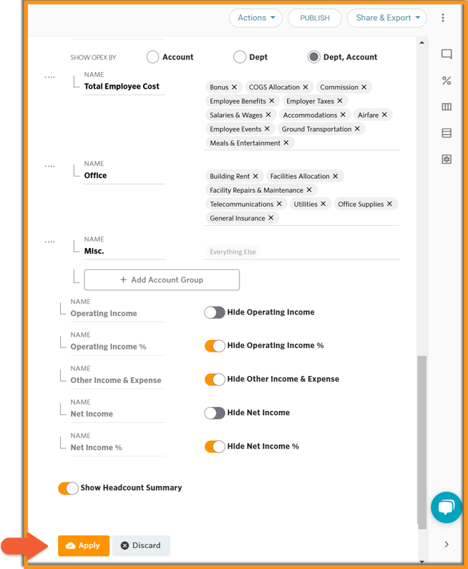 5. Continue to add account groups into the Revenue, COGS, and OpEx sections of the income statement and then select "Apply" at the bottom