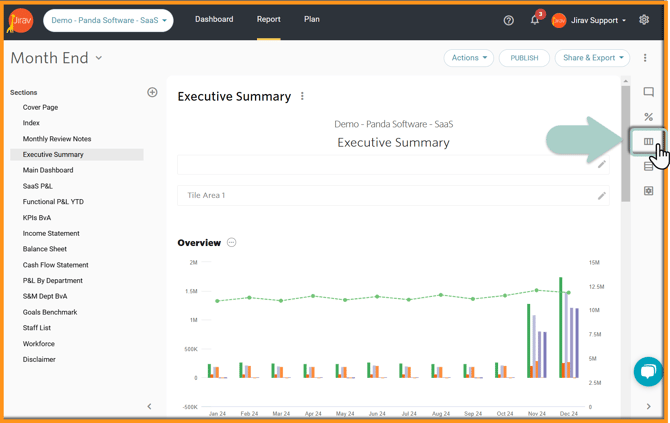 Jirav provides the ability to add together different accounts from your income statement into customized rows within the Executive Summary Report.